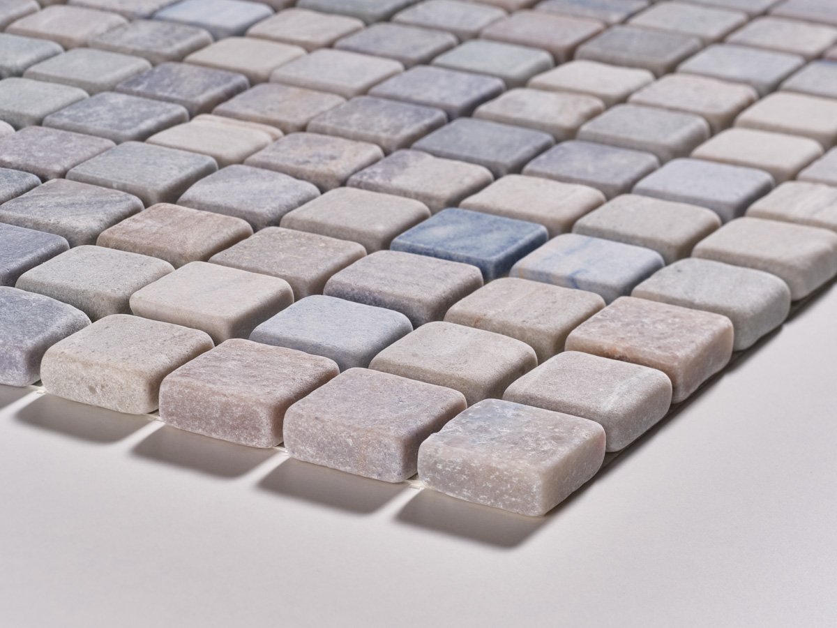 Il mosaico in Azul Macaubas anticati burattato porta con sé l’intensità unica della quarzite brasiliana, famosa per le sue spettacolari sfumature blu e azzurre che richiamano i colori dell’oceano. Ogni tessera è un frammento di natura, capace di trasformare qualsiasi superficie in un’opera di design.