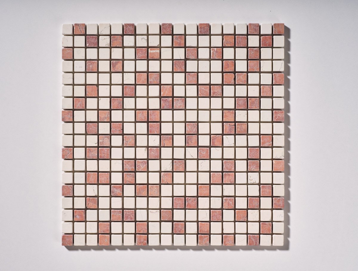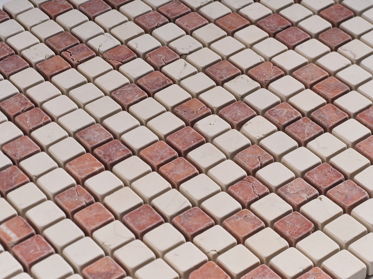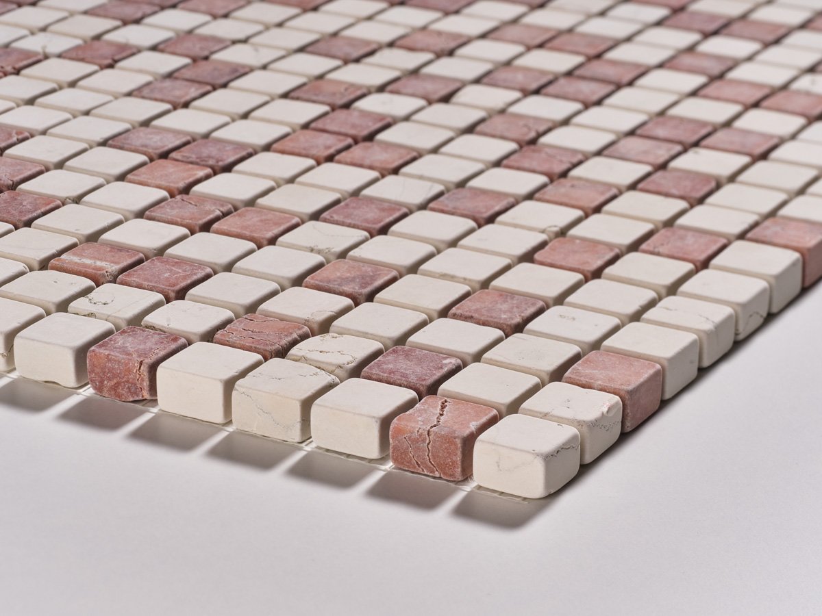 Il mosaico in Bianco Asiago e Rosso Verona anticati burattati unisce la luminosità del marmo chiaro alla vivacità delle tonalità rosse, creando un contrasto caldo e raffinato. La finitura anticata aggiunge carattere e un fascino senza tempo, ideale per chi ama atmosfere naturali ed eleganti.