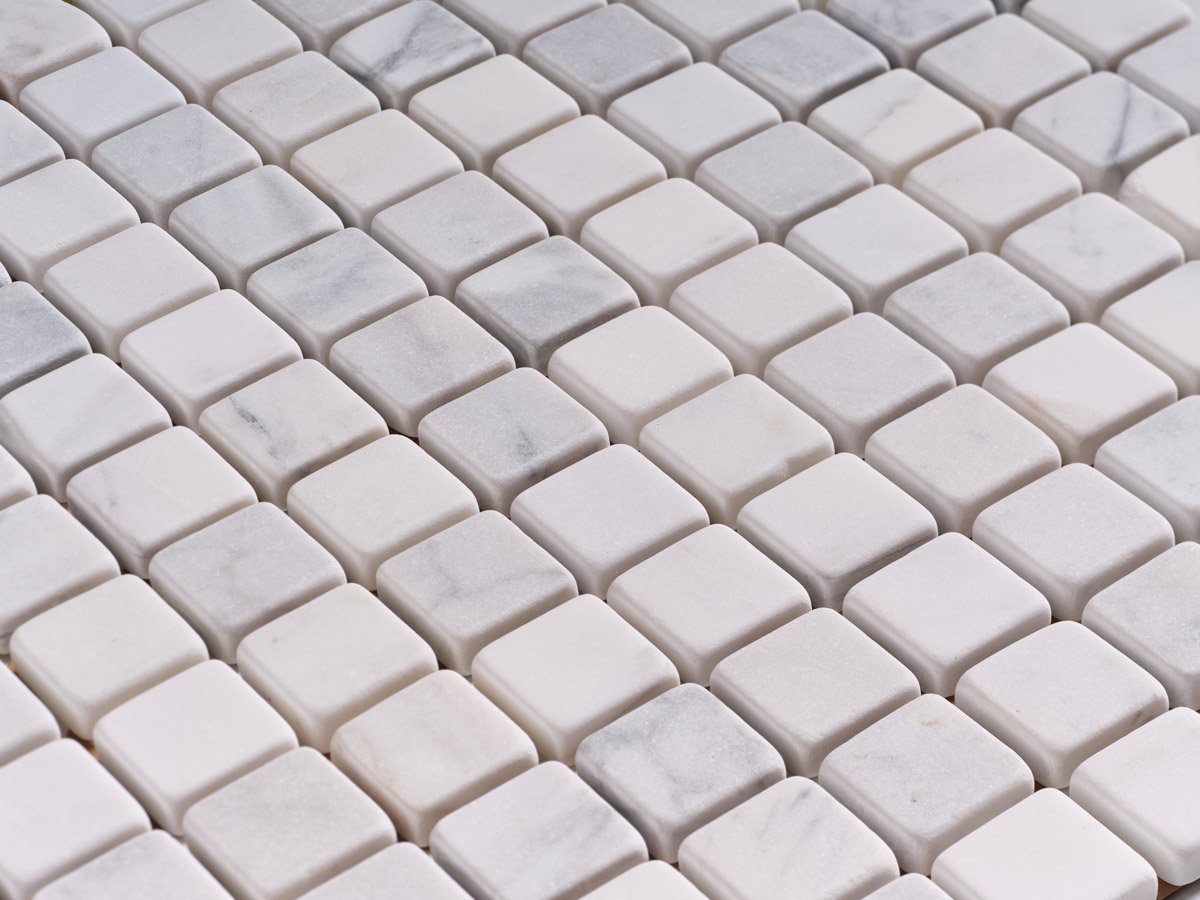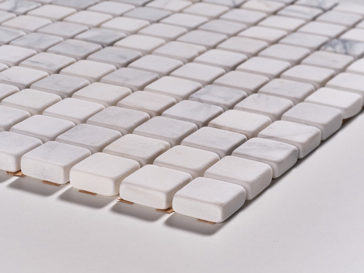 Il mosaico in Bianco Carrara anticati burattato valorizza la bellezza senza tempo del marmo italiano. Le tessere quadrate dai bordi leggermente irregolari conferiscono un fascino autentico e naturale, ideale per chi desidera un rivestimento elegante ma dal carattere unico.
