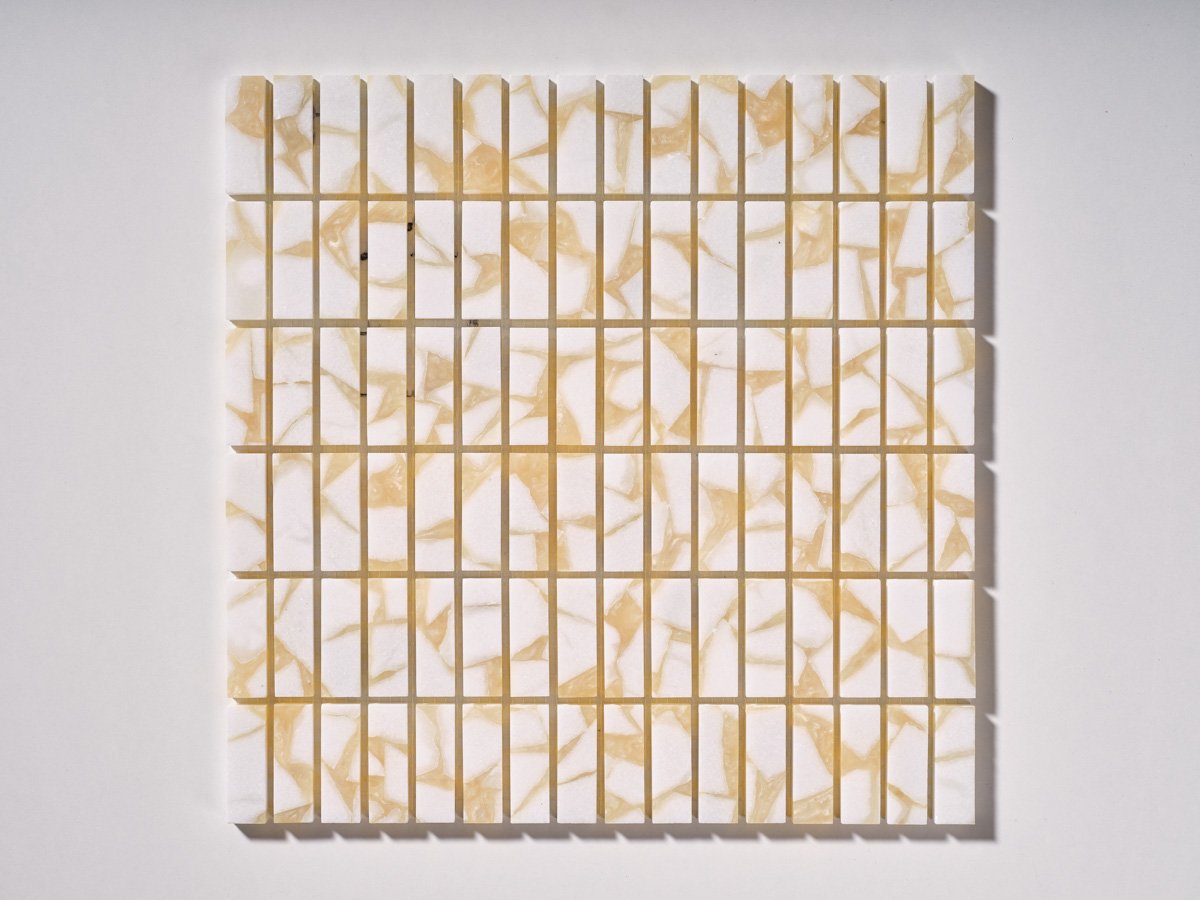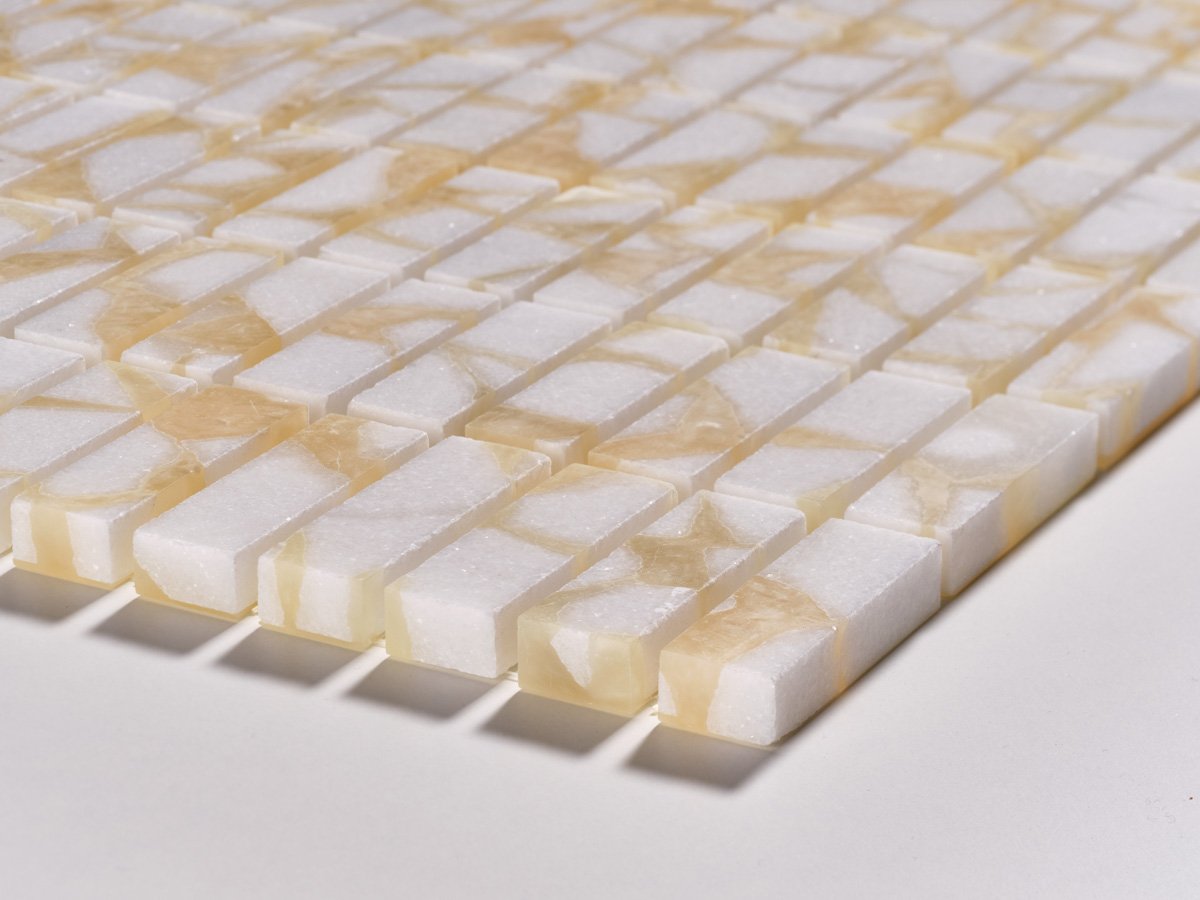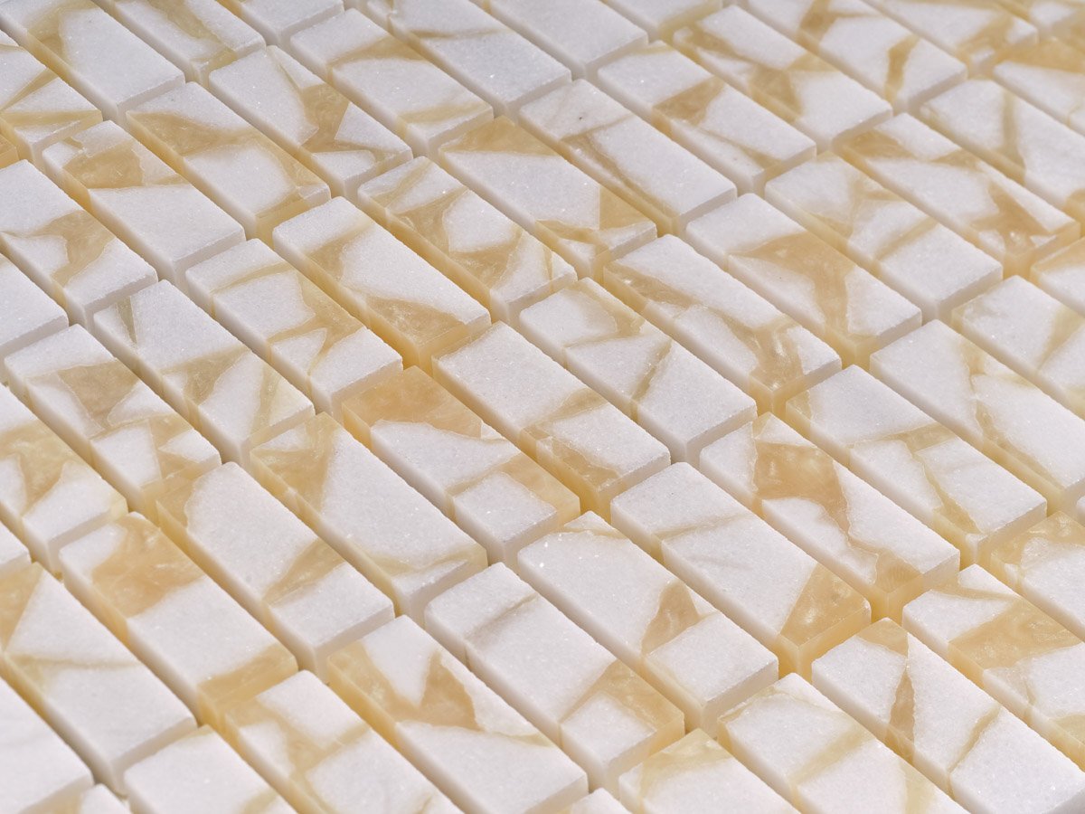 Il mosaico in Bianco Sivec con Resina Gold lucido unisce la purezza del marmo bianco alla brillantezza dei dettagli dorati in resina, creando un effetto di lusso e raffinatezza senza pari. Ogni tessera rettangolare riflette la luce, esaltando la luminosità degli ambienti e aggiungendo un tocco prezioso.