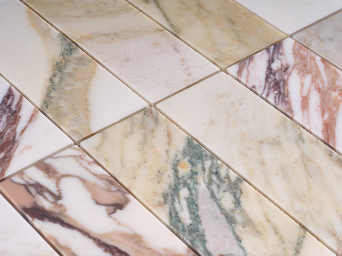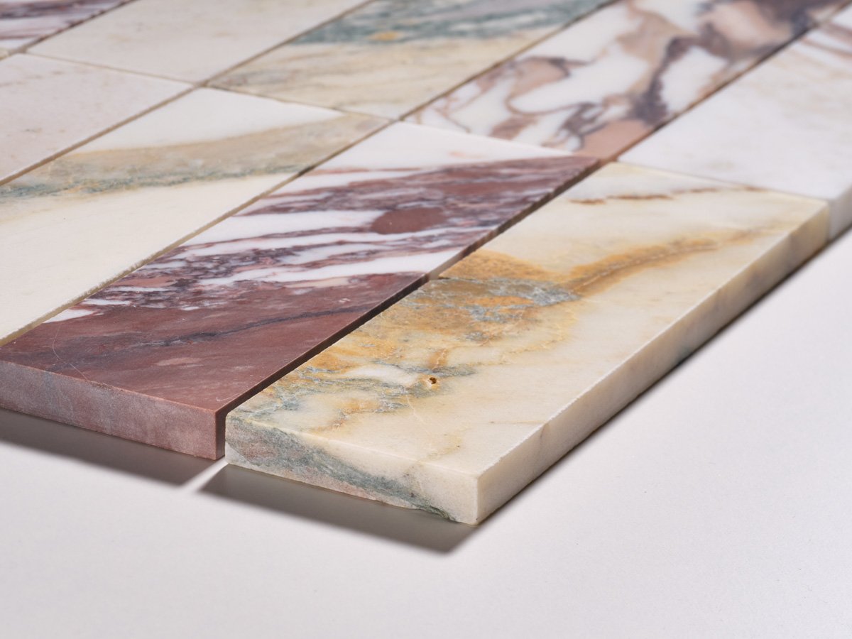 Il mosaico in Breccia Capraia levigato opaco è un capolavoro di eleganza e raffinatezza. Le venature uniche di questo marmo, dalle sfumature intense e naturali, donano a ogni ambiente un carattere distintivo e sofisticato. La particolare forma rettangolare delle tessere amplifica la sensazione di movimento e dinamismo sulle superfici.