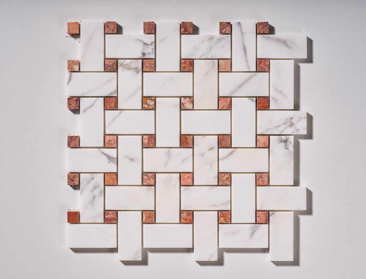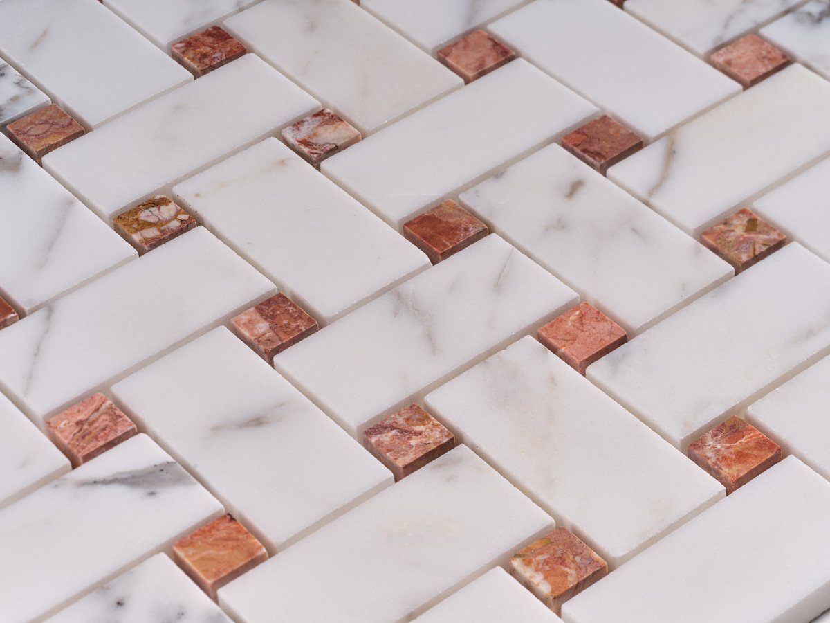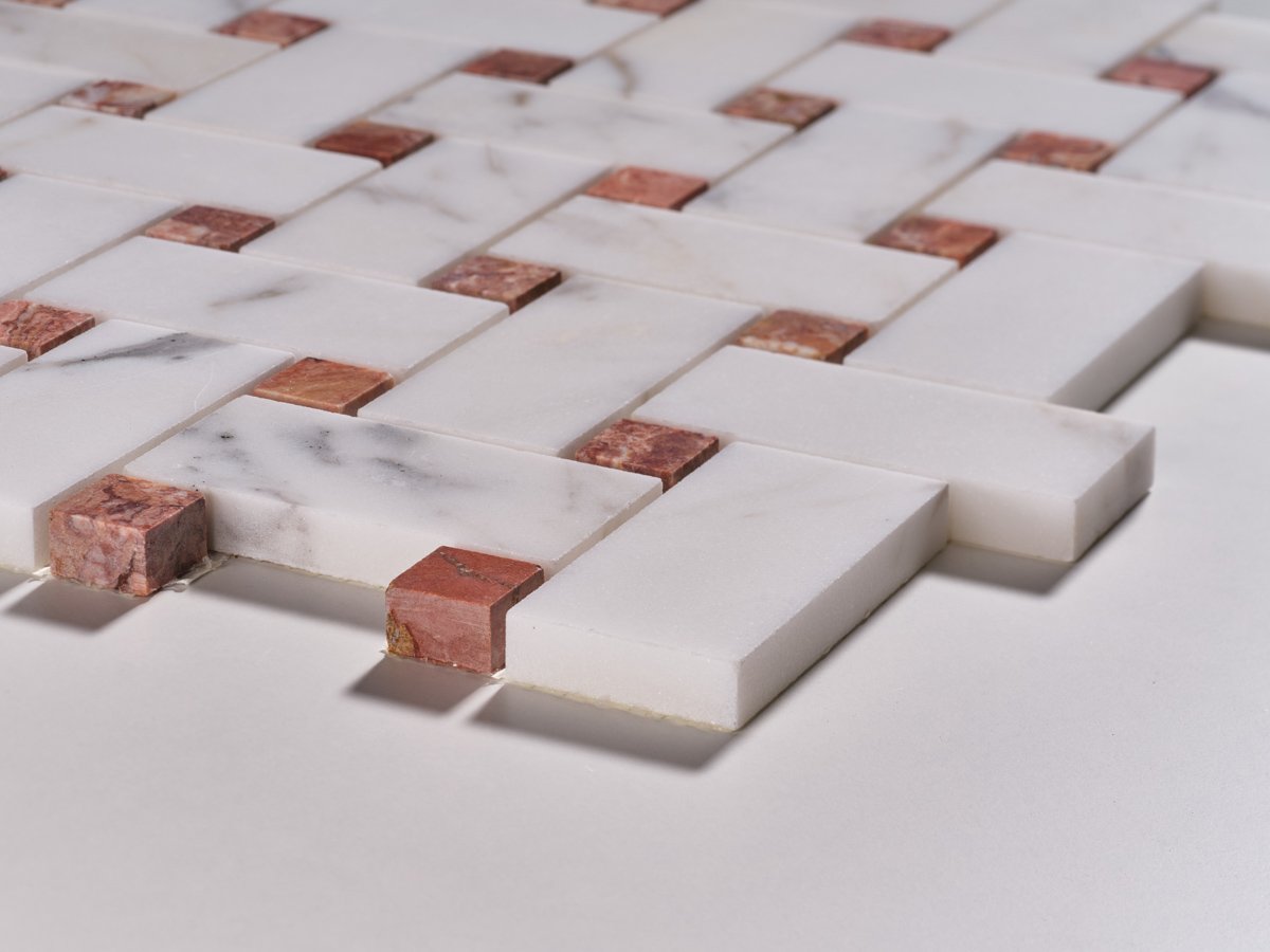 Il mosaico in Calacatta e Breccia Pernice levigato opaco unisce due marmi italiani di grande prestigio: la raffinatezza delle venature del Calacatta e le sfumature calde della Breccia Pernice. La combinazione di formati rettangolari e quadrati dona dinamismo e originalità, trasformando le superfici in vere e proprie composizioni di design.