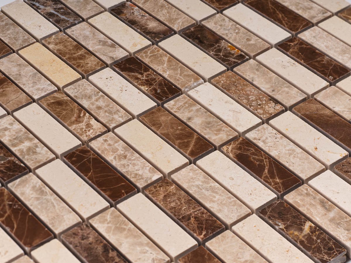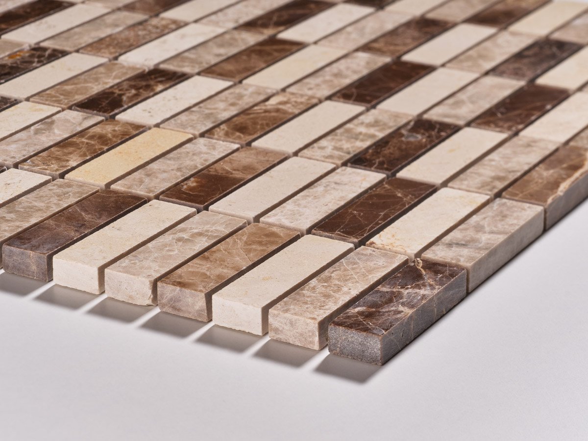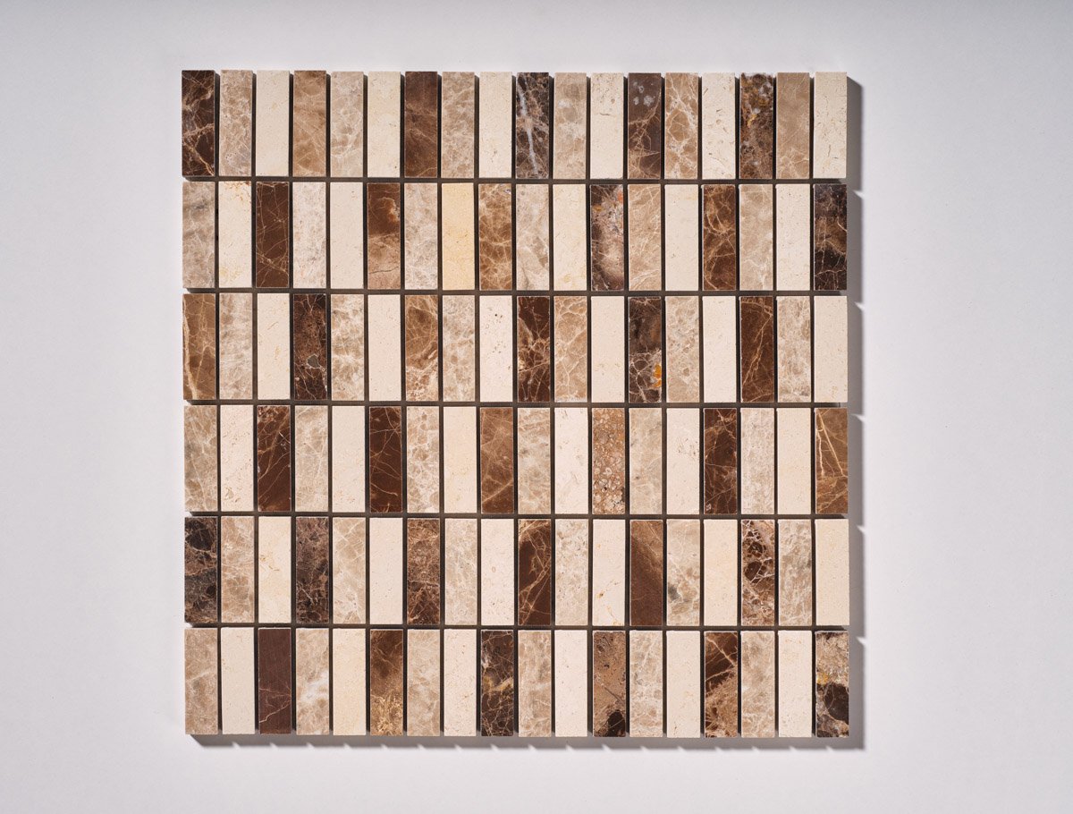 Il mosaico in Emperador Dark, Emperador Light e Crema Luna lucido combina tre varietà di marmo pregiate, creando un gioco di contrasti raffinati tra toni scuri, medi e chiari. Le tessere rettangolari, con la loro finitura lucida, riflettono la luce e donano dinamismo ed eleganza a ogni ambiente.