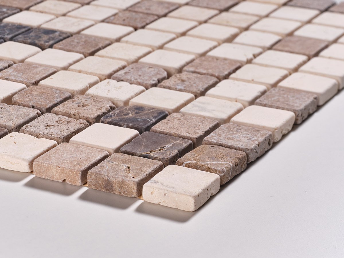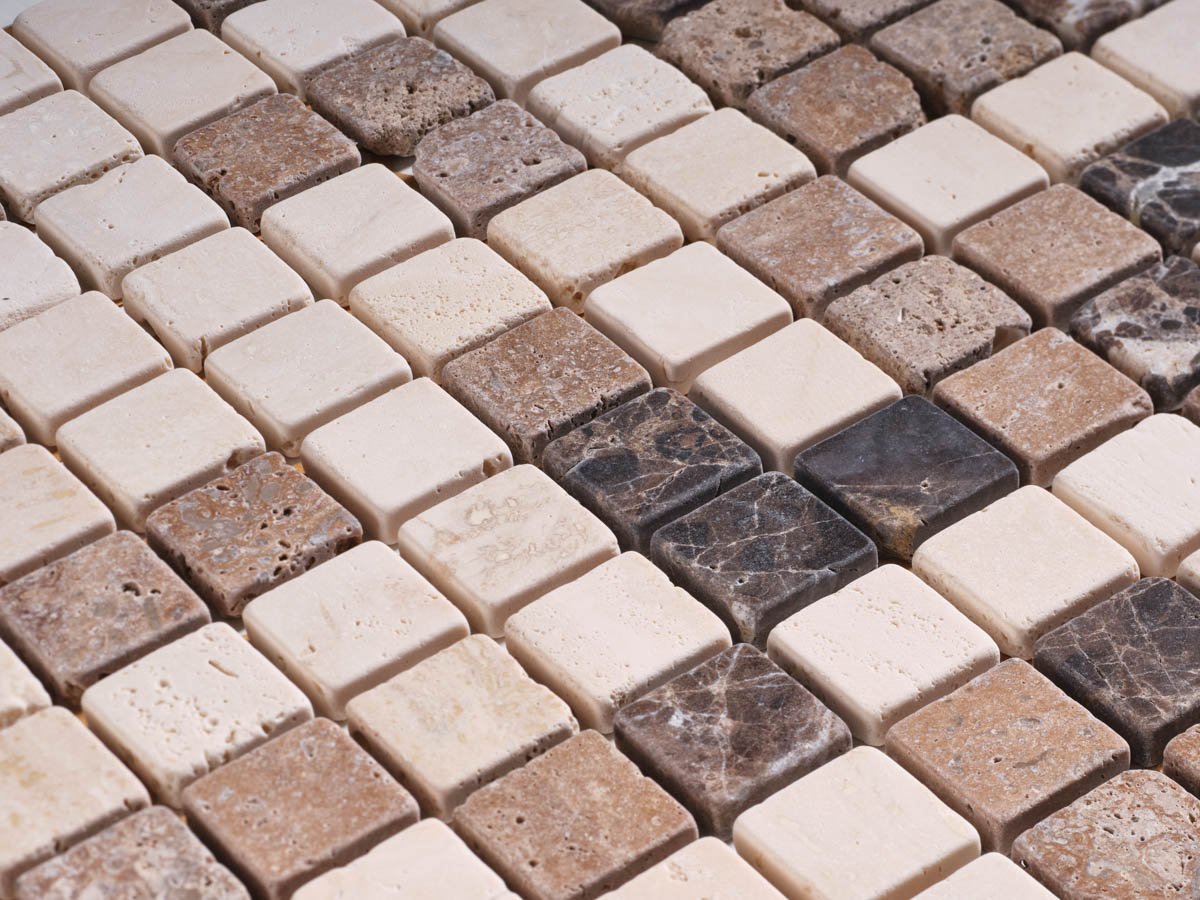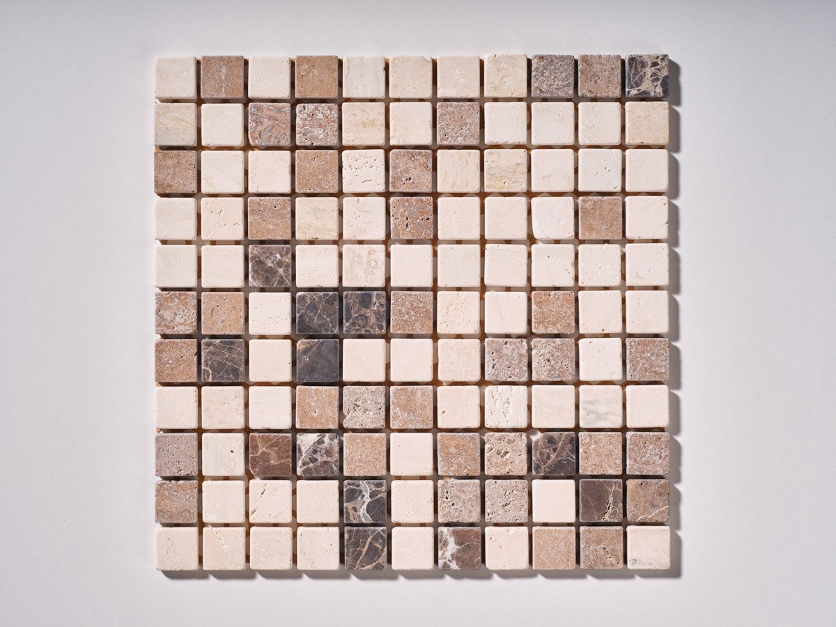 Il mosaico in Emperador Dark e Travertini (Noce, Classico e Navona) unisce la profondità del marrone con le sfumature calde e naturali del travertino. La superficie anticata burattata dona un aspetto autentico e raffinato, rendendolo ideale per pavimenti e rivestimenti di ambienti interni ed esterni coperti.
