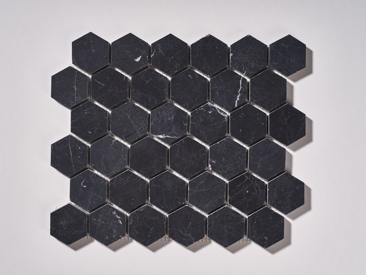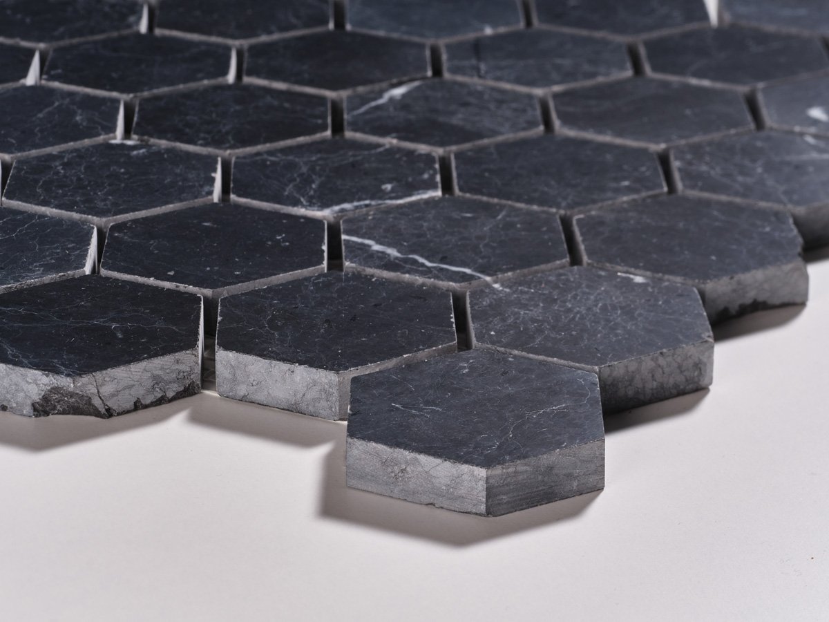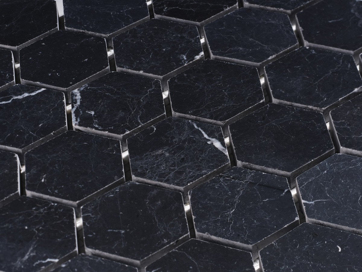 Il mosaico Nero Marquina si distingue per il suo carattere deciso e sofisticato. Le tessere esagonali, con finitura levigata opaca, donano un effetto moderno e di grande impatto visivo, perfetto per pavimenti e rivestimenti eleganti.
