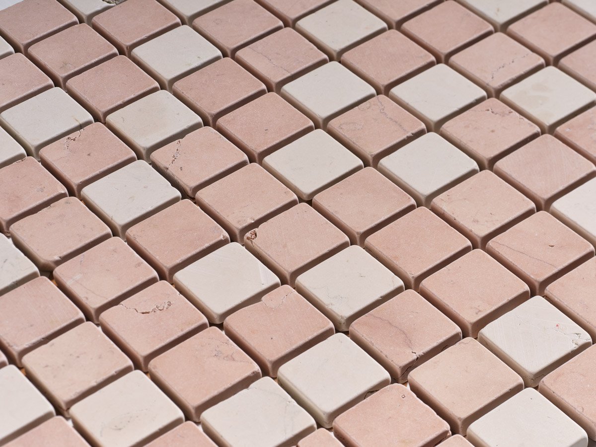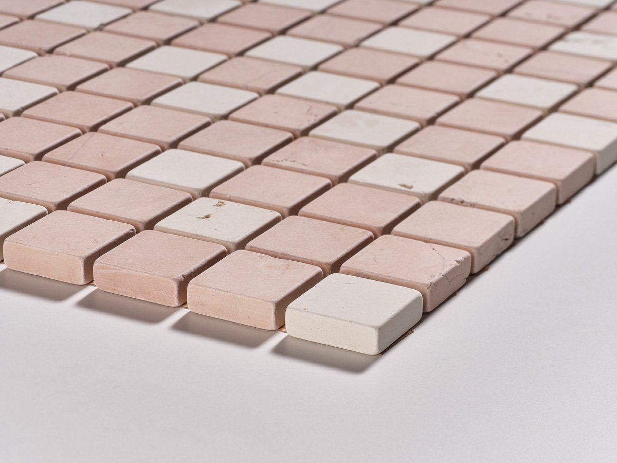 Il mosaico Rosa Perlino e Bianco Asiago anticati burattati regala un connubio di delicatezza e naturalezza. Le tonalità calde del rosa si fondono armoniosamente con il bianco luminoso, creando superfici raffinate e accoglienti.