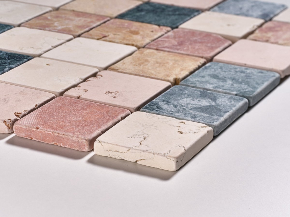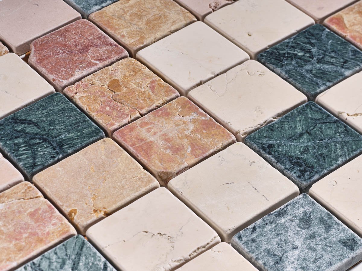 Questo mosaico multicolore racchiude la ricchezza cromatica del Rosso Verona, Giallo Reale, Rosa Perlino, Bianco Asiago e Verde Guatemala. La superficie anticata burattata esalta la naturale bellezza del marmo, creando giochi di luce e texture unici. Perfetto per pavimenti e rivestimenti in ambienti interni ed esterni coperti, aggiunge carattere e autenticità a ogni spazio.