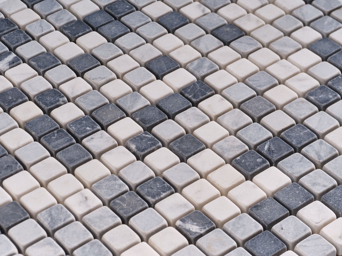 Il mosaico in Nero Marquina, Bardiglio e Bianco Carrara racchiude l’eleganza dei contrasti cromatici tra il nero intenso, il grigio raffinato e il bianco luminoso. La superficie anticata burattata esalta le venature naturali dei marmi, creando un effetto materico e ricercato.
