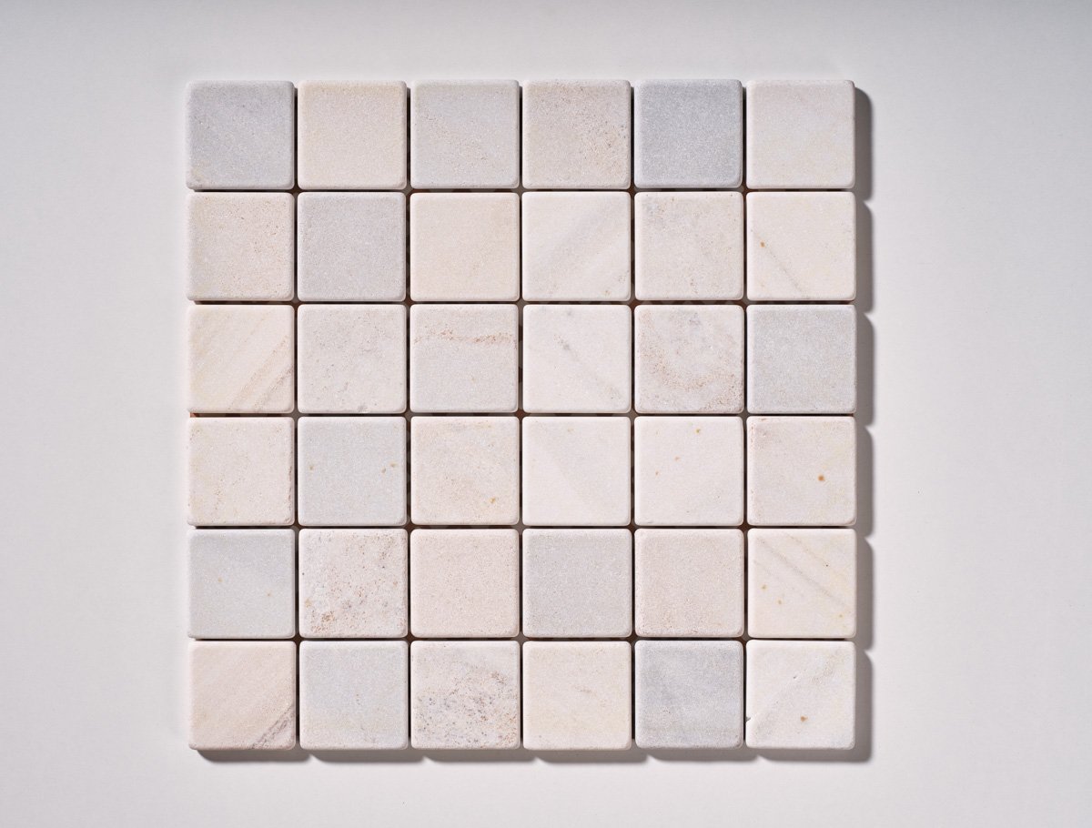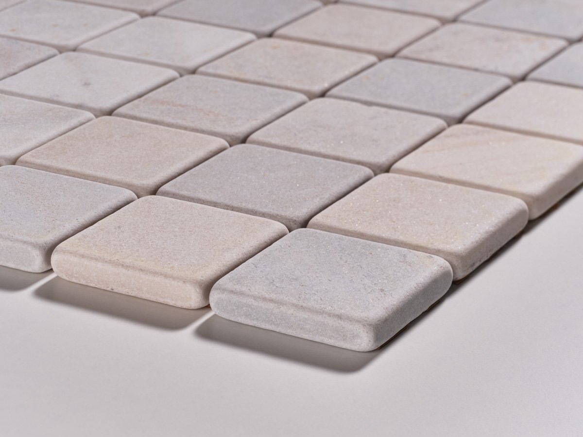 Il mosaico in Palissandro Classico e Palissandro Bluette anticati burattato combina le raffinate tonalità calde del Palissandro con le sfumature delicate del Bluette, creando un contrasto elegante e naturale. Ogni tessera racconta la bellezza unica del marmo italiano, con una texture che esalta la matericità della pietra.
