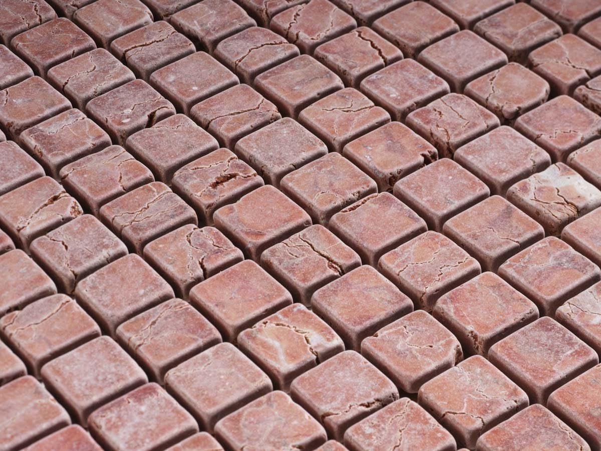 Il mosaico Rosso Verona anticato burattato porta calore e personalità negli spazi grazie al suo colore intenso e alla finitura naturale. Le tessere compatte rendono ogni superficie unica e ricca di fascino, ideale sia per pavimenti che per rivestimenti.