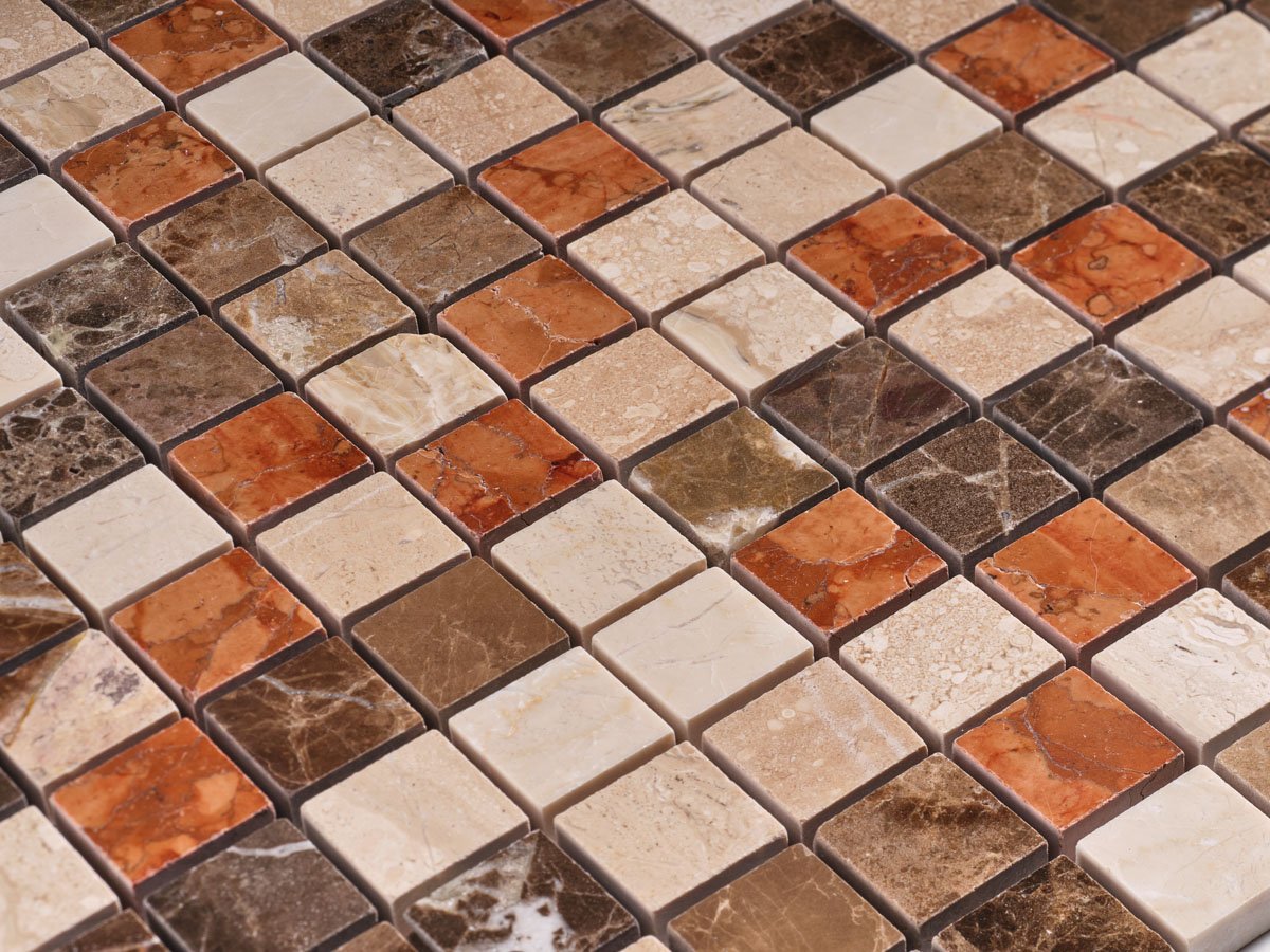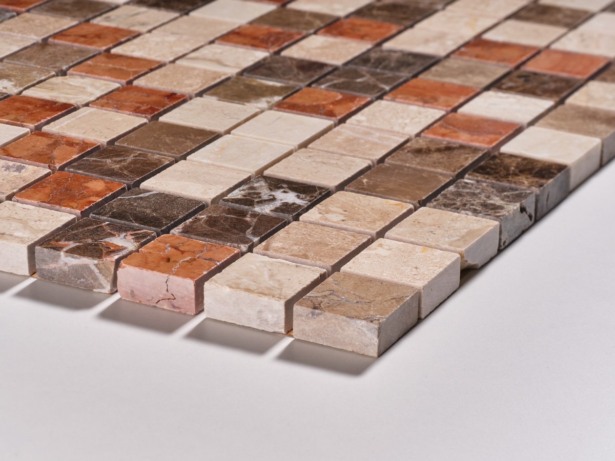 Il mosaico Rosso Verona, Emperador Dark, Breccia Sarda e Botticino unisce quattro marmi pregiati in un’unica soluzione dal carattere deciso ed elegante. Le tessere lucide riflettono le diverse tonalità creando un gioco cromatico raffinato, ideale per pavimenti e rivestimenti interni che vogliono distinguersi. Una scelta perfetta per ambienti di design che cercano esclusività e prestigio.