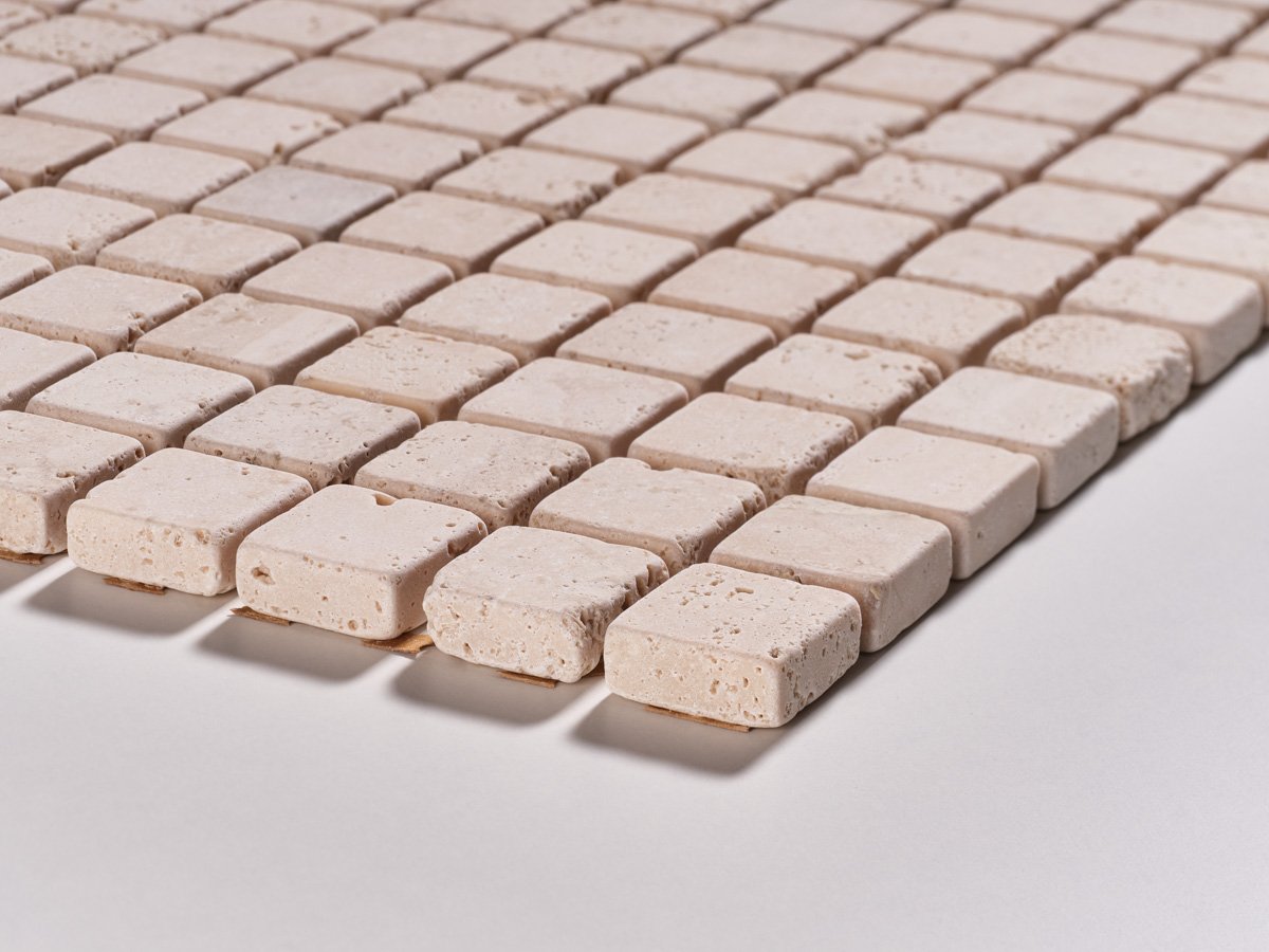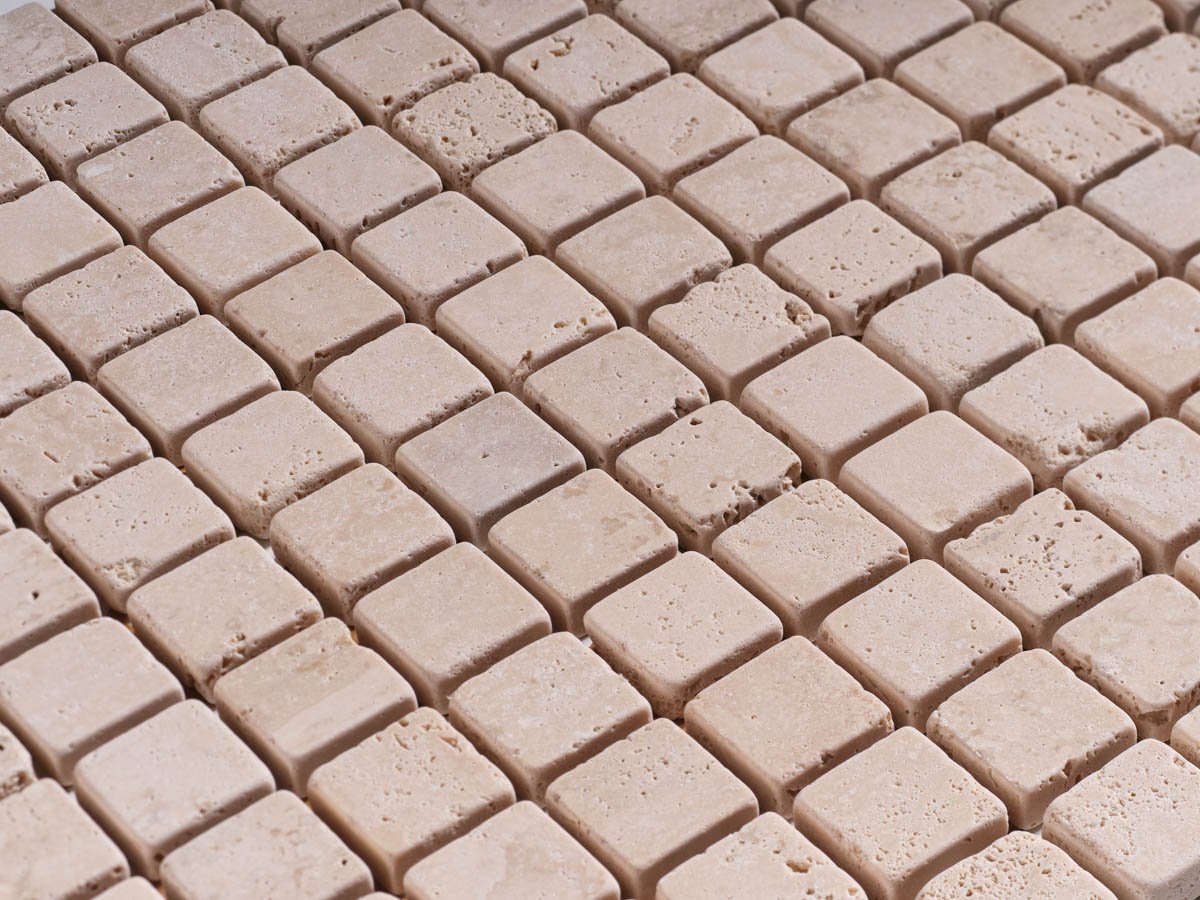 Il mosaico Travertino Classico anticati burattato porta con sé tutto il fascino della pietra naturale. Le tonalità calde e le venature tipiche del travertino creano superfici eleganti e intramontabili, perfette per rivestimenti e pavimenti.